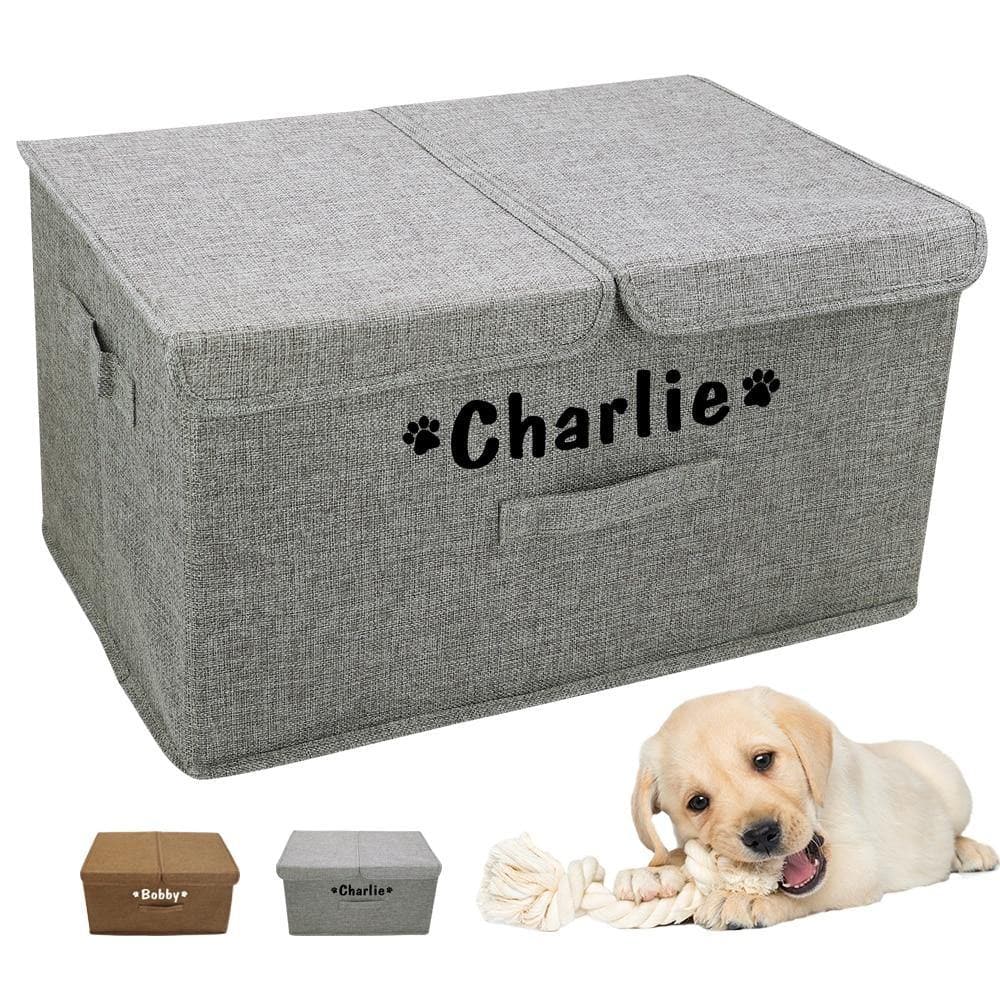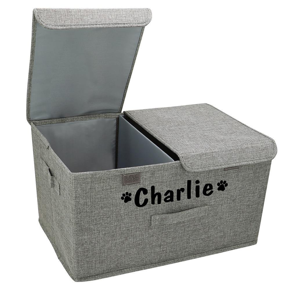 No more arguments over where to store pet toys and other goodies. Our Large Double Bang pet toy boxes come personalised with your pets name and feature a foldable design and dual storage compartments.